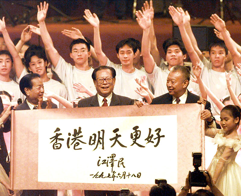 1997年7月1日上午10时,中华人民共和国香港特别行政区成立庆典在香港会展中心新翼举行。在庆典仪式上展示了江泽民同志亲手题写的“香港明天更好”书法卷轴。