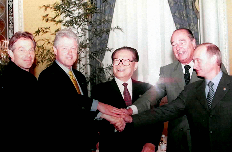 2000年9月7日,由中国倡议的联合国安理会五个常任理事国首脑会议在纽约举行。江泽民同志(中)同法国总统希拉克(右二)、俄罗斯总统普京(右一)、英国首相布莱尔(左一)、美国总统克林顿(左二)握手合影。